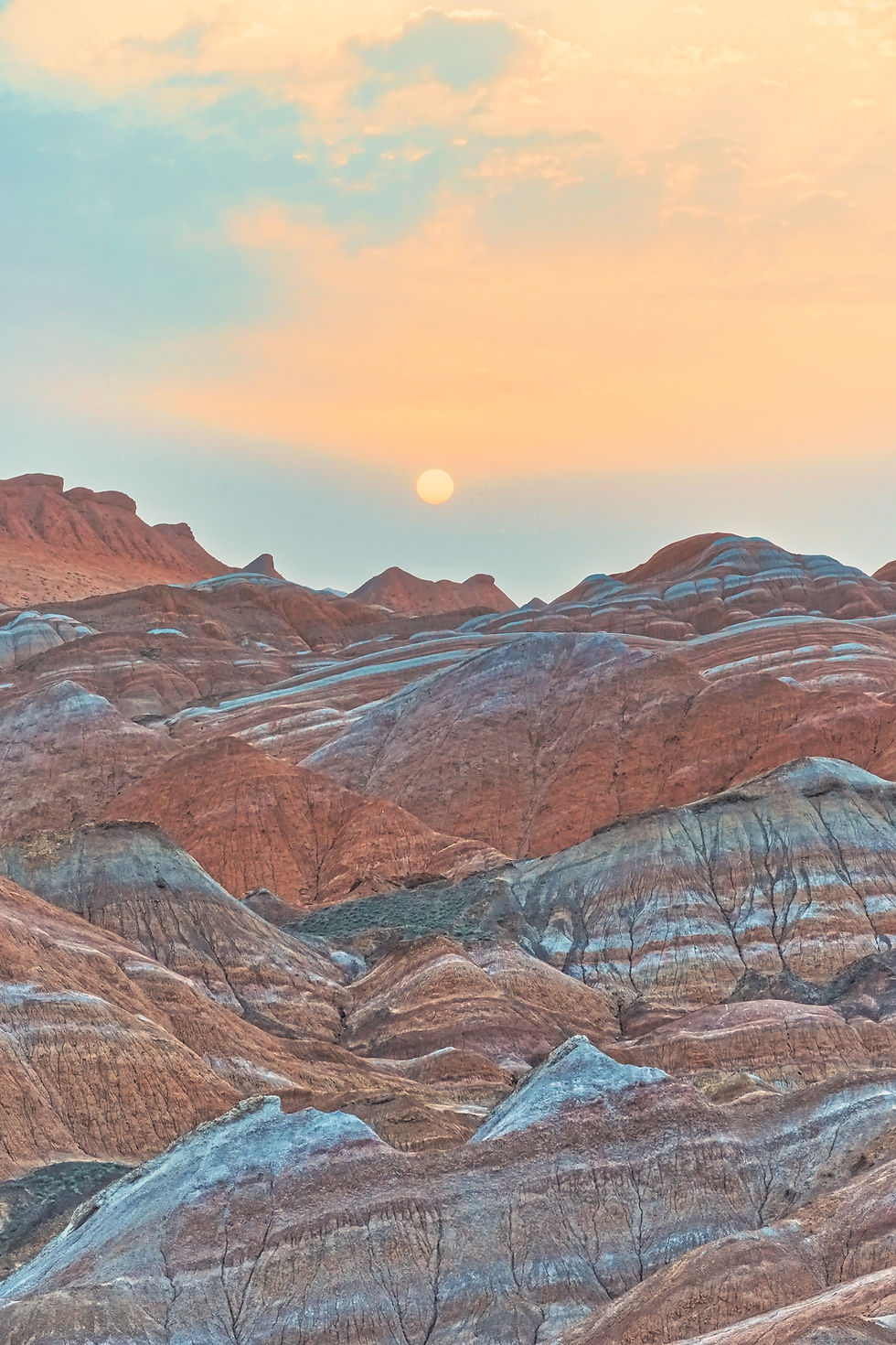 [칠채산의 황홀한 일출] 어제 칠채산의 일몰을 보지 못했던 아쉬움은 오늘 일출에 대한 기대를 더욱 간절하게 만들었어요. 현지 가이드님이 최고의 명소라고 추천해주신 2번 전망대로 향했습니다. 동쪽 하늘이 물들기 시작하고, 마침내 태양이 솟아오르는 찰나, 빛이 닿는 곳마다 칠채산의 다채로운 결들이 붉게 타오르며 깨어나는 모습은 그야말로 황홀경이었어요. '팔레트 위의 물감'이라는 표현으로는 부족한, 살아 움직이는 거대한 예술 작품이었습니다.
