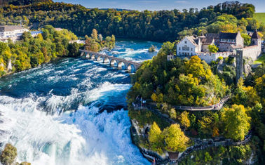 빙하 시대 지질 구조학적 변형으로, 라인 강은 15,000여 년 전에 새로운 강바닥으로 흐르게 되었다. 라인 폭포는 단단한 석회암에서 무른 자갈로 변하는 전환 지점에 생성되기 시작했습니다. 150m가 넘는 폭, 초당 23m의 속도로 깊이 떨어지는 수백 입방미터의 폭포수가 압권입니다.